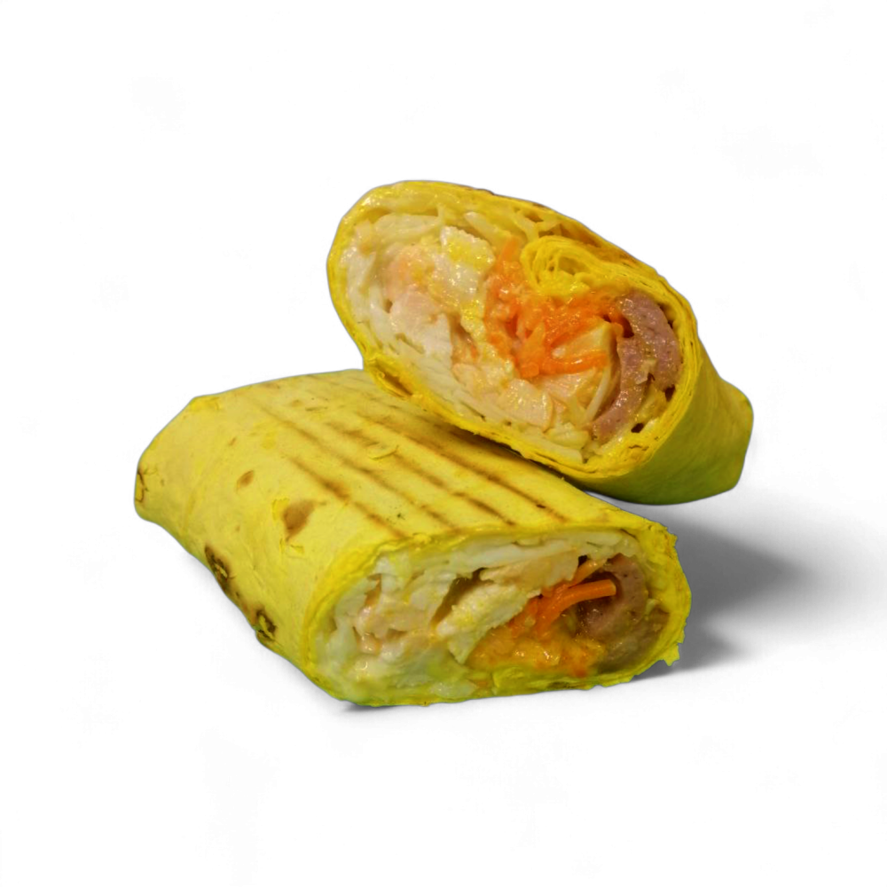 Лаваш, соус фирменный, филе куриное гриль, капуста, морковь корейская, колбаска охотничья, горчичный соус. Вес: 315/465 грн